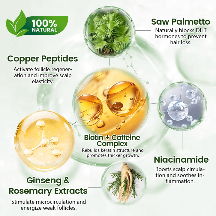 Saw Palmetto and plant sterols inhibit DHT — the primary hormone responsible for follicle shrinkage — effectively reducing shedding and preventing further loss.